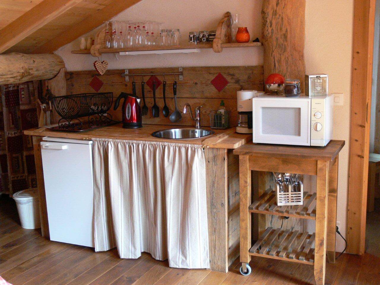 Évier, frigo, micro-onde, plaque induction 1 feu, cafetière et bouilloire, vaisselle